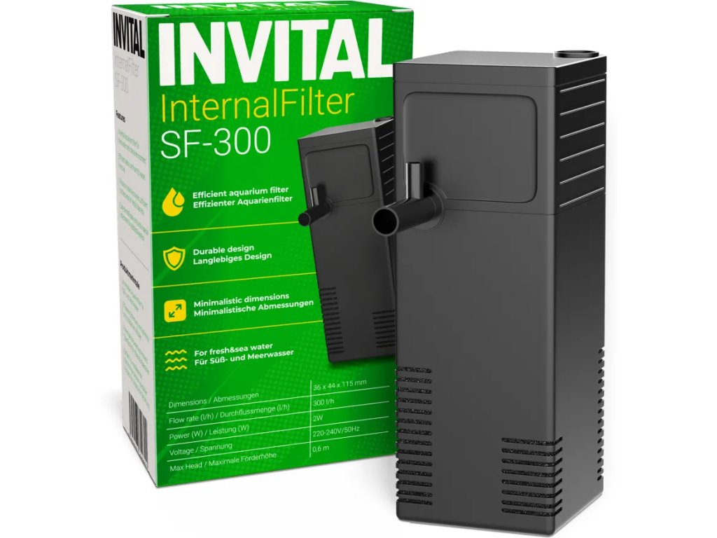 INVITAL InternalFilter SP-300 ✅ je spolehlivý vnitřní filtr určený pro menší akvária. Díky své jednoduché konstrukci a malé velikosti se snadno instaluje, nezabírá mnoho místa a přitom poskytuje kvalitní mechanickou i biologickou filtraci. Filtr je vybaven biomolitanovou vložkou, rozstřikovací rampou a provzdušňovacím nástavcem, takže kromě čištění vody zajišťuje také její okysličování a jemné proudění.